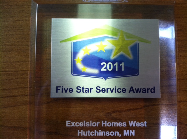 Excelsior Homes West, Inc. of Hutchinson, MN has been awarded the 5 Star Award from Schult Homes of Redwood Falls, Minnesota. This award is for achieving excellence by committing to customer satisfaction.