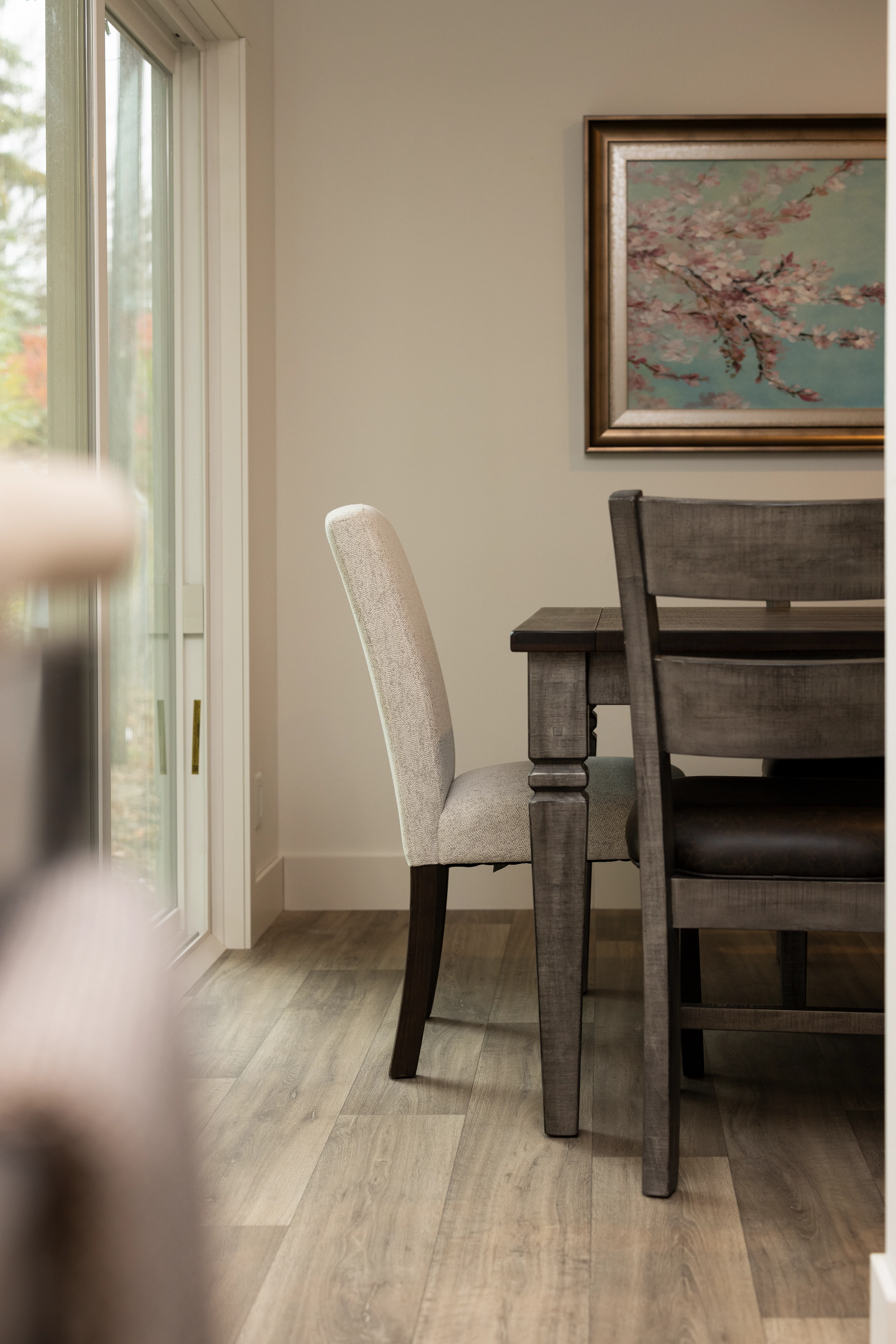 Inside, the Hey Jude's kitchen is designed to be practical and inviting, featuring DuraCraft cabinetry with 42″ overhead storage, a stainless steel sink with pull-down faucet, Samsung stainless steel appliances, and an industrial-style range hood. The dining area sits just off the kitchen, keeping everyday meals and routines connected. The primary bedroom includes its own bathroom with a fiberglass shower, while the additional bedrooms are located nearby and served by a centrally placed second bathroom. Built-in storage throughout the home, along with features like an ecobee Smart Thermostat, high-efficiency gas furnace, and Rheem hybrid water heater, support long-term efficiency and reliability, making the Hey Jude a home that feels manageable, functional, and easy to settle into.